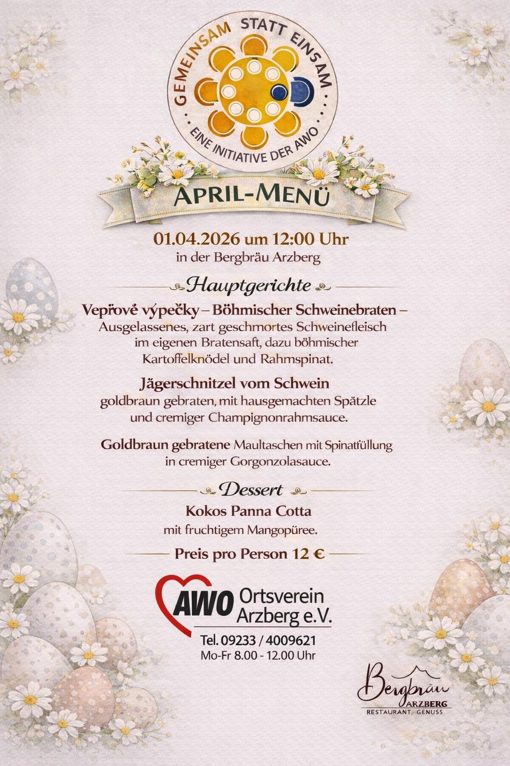 Wir laden am 01.04.2026 wieder ein zu einem gemeinsame Mittagessen in der Gaststätte Bergbräu in Arzberg. Für alle die Lust auf ein leckeres Mittagessen mit anderen Menschen haben. Einmal im Monat, immer um 12 Uhr, immer lecker und günstig und im Kreis mit anderen Menschen. Um Anmeldung vorab wird gebeten unter 09233/40096-21. Beitragsnavigation AWO Frühstück am 22.04.2026